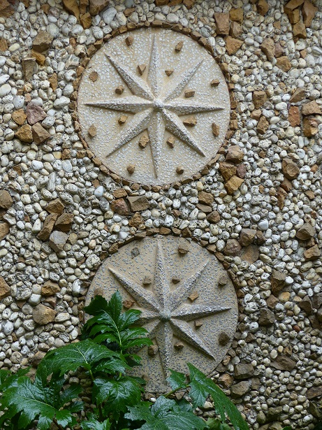 "Ce jardin est composé d'un ensemble de colonnes et de traverses décorées de milliers de coquillages dispersés savamment en alternance avec des pierres qui tapissent l'ensemble des surfaces.