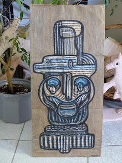 (Peinture recto verso : sac à ordure officiel suisse en papier kraft . Papier froissé, coquilles de noix, lichen, pomme de pin, foin d'artichaut, acrylique)