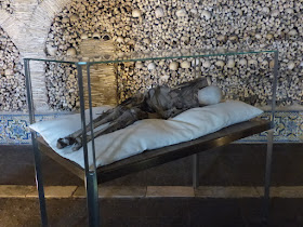 Certains crânes sont ornés de graffitis. Deux cadavres en dessiccation, dont un d'enfant, sont par ailleurs pendus par des chaînes. La phrase Melior est dies mortis die nativitatis (« Le jour de la mort vaut mieux que celui de la naissance ») tirée de l'Ecclésiaste (7.1-6) est inscrite au plafond. Les ossements des moines qui ont édifié la chapelle se trouvent dans de petits coffres blancs. L'édifice, bien que fascinant, peut paraître morbide, mais il fut érigé par les franciscains dans un but religieux. Au XVIe siècle, l'espérance de vie était plus courte et la mort ou la maladie soudaines. La chapelle est donc également une manifestation de la piété de l'époque.