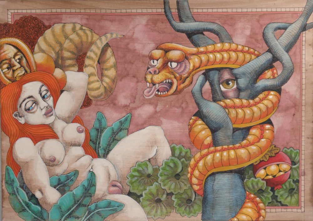 "Dans les dessins de Patba58, on se torture avec exubérance, on s'éventre avec gourmandise, on se découpe avec un sourire en coin, dans l'opulence des chairs et des corps. On se bondit dessus, on se transperce, on se pourfend, au sein d'un univers envoûtant truffé de symboles occultes. Il s’agit le plus souvent de duos : deux êtres humains, créatures hybrides ou animaux, s’affrontent passionnément. Les regards sont écarquillés, semblant nous signifier que nous sommes ici dans une sorte de transe faussement macabre, en réalité jouissive, où l’on se livre à des luttes, on se dévore, on se pourfend avec des poignards ou des dagues splendides, ornementées; où des yeux partout nous regardent, où l’on s'aime et s'embrasse tout en s’harponnant de hameçons, se perçant de clous, de lames, de sexes aussi, toujours avec exaltation. Ces créatures sont occupées à une célébration, celle de la transgression. Souvent elles se tournent légèrement vers nous, les spectateurs, nous prenant à témoin, de leurs grands yeux fixes, brillants et hypnotiques, des sévices inavouables (mais exaltants et débridés) auxquels elles s’adonnent devant nous."
